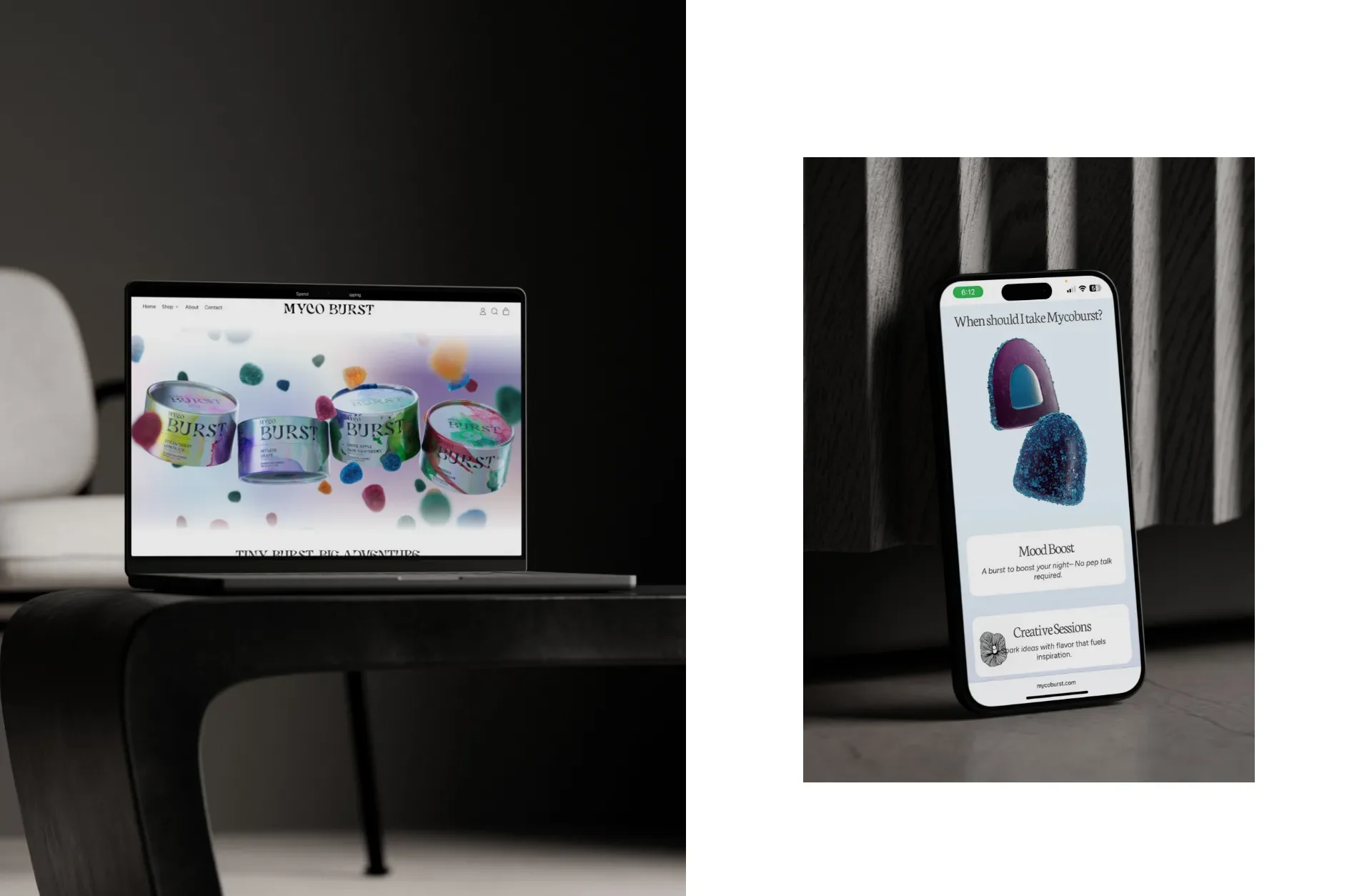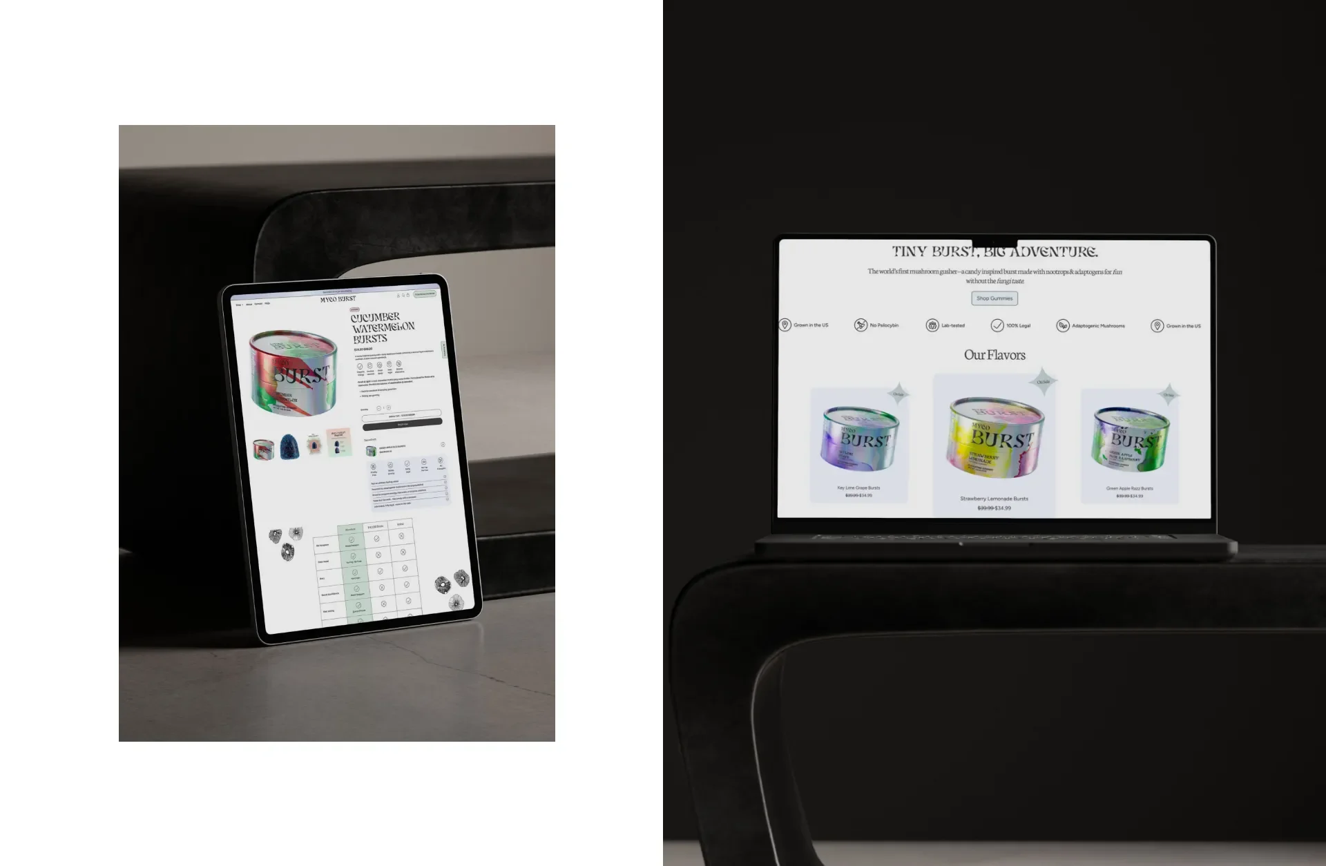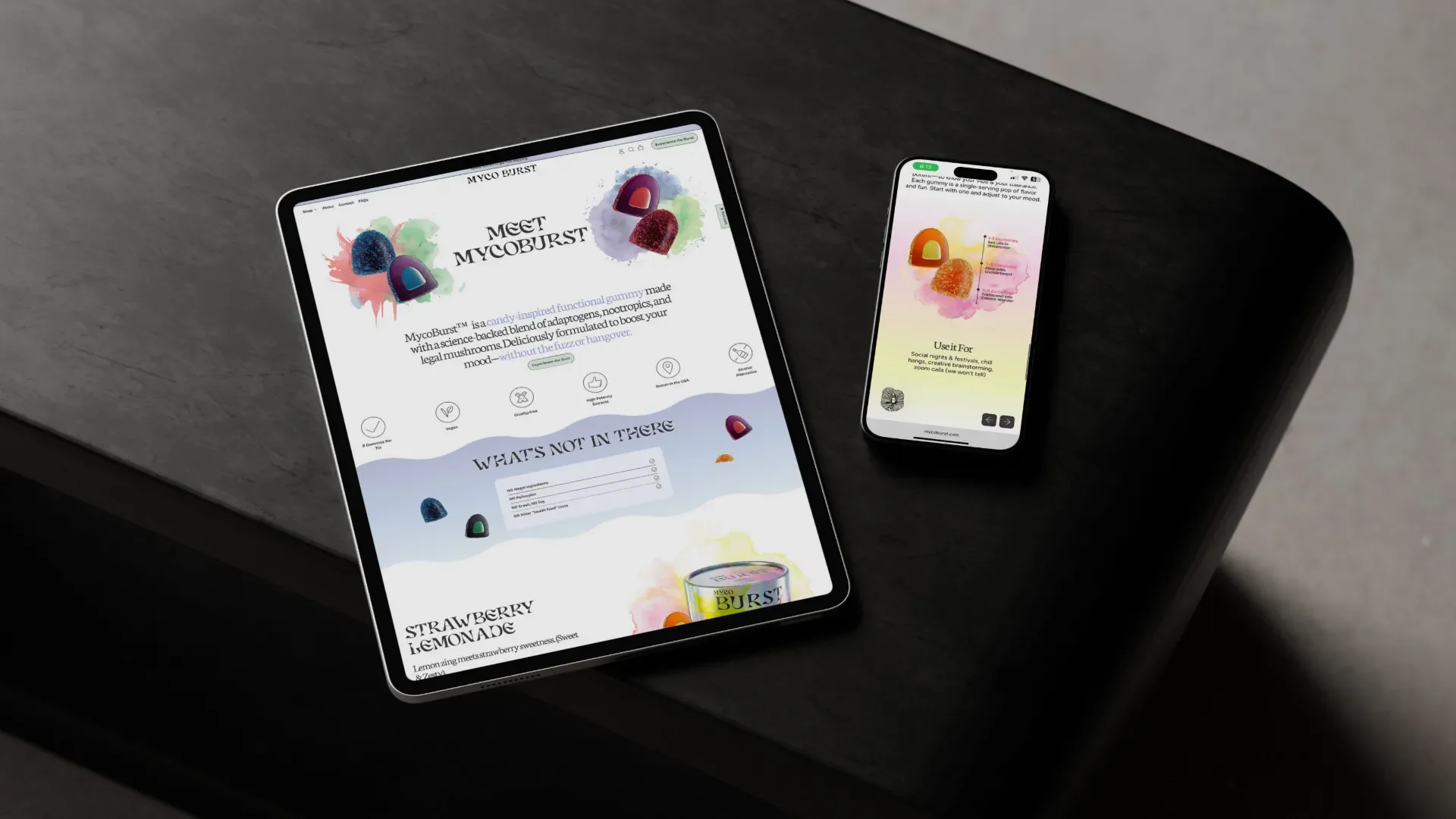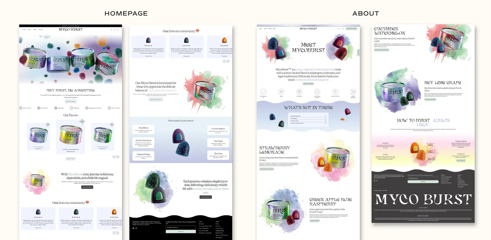 These backgrounds also helped express the “burst” in MycoBurst by showing how each gummy feels colorful, juicy, and energetic. It visually communicates the idea of flavor meeting function.
