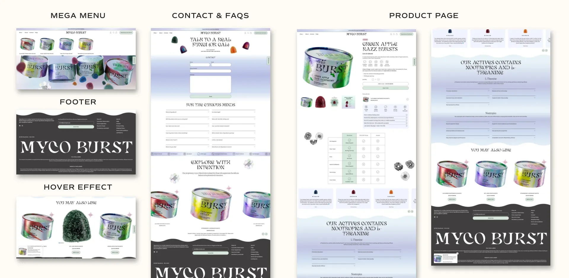 To enhance the playful futuristic personality, I designed a custom cursor that looks like a single gummy. This detail is small but highly effective. It makes the entire site feel more immersive and gives visitors a sense of stepping into the MycoBurst world.
