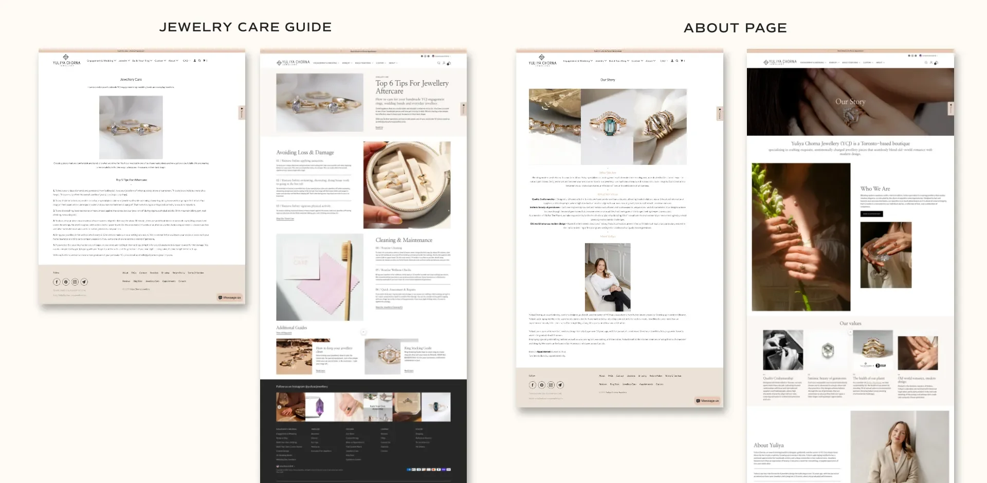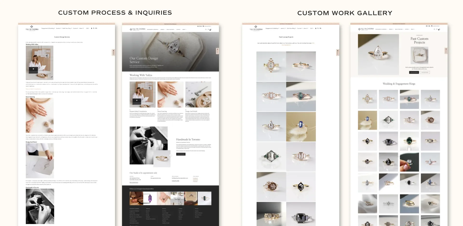 The final site feels like a romantic, old world studio brought to life online. Customers can navigate easily, learn about the brand’s values, and explore the custom process without confusion. The structure is thoughtful, the visuals are polished, and the entire experience reflects the artistry and integrity of Yuliya’s work.