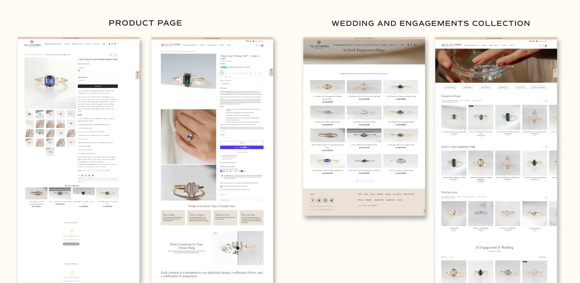 Yuliya’s business is multi layered with custom pieces, made to order designs, ready to ship items, and a build your own ring experience. To support this, I organized collections in a way that guides shoppers easily and naturally.