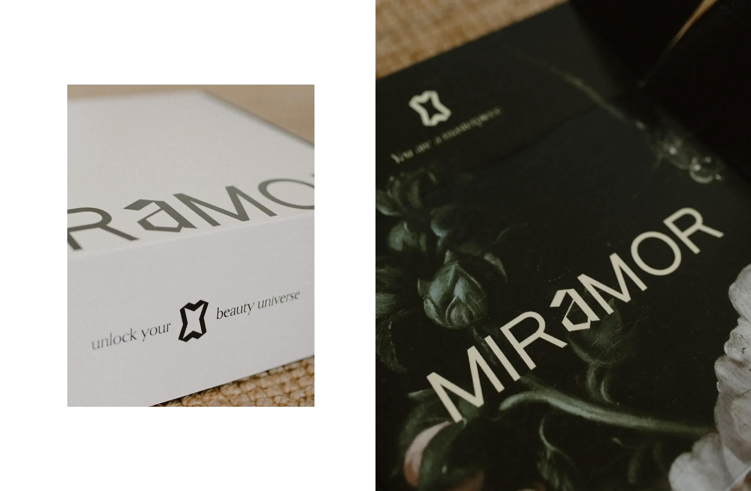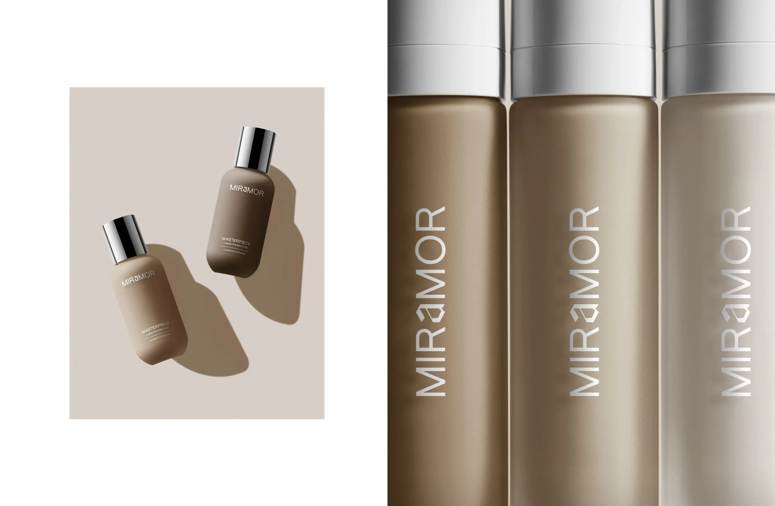 Miramor is a cosmetics brand that focuses on minimal makeup solutions that enhance a woman's natural beauty. The name "Miramor" is a combination of the Latin words "Mira" which means "wonderful" and "amor" which means "love". The typography design accentuates the letter "a" where the two words overlap in spelling, fusing them together into one brand mark.