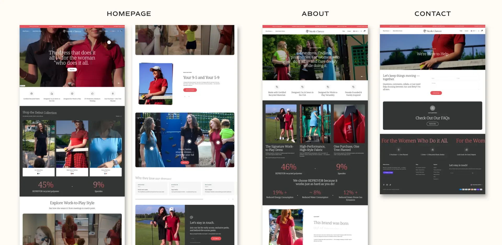 The site needed to instantly communicate why her dresses sit at a premium price point. Layouts highlight fabric technology, craftsmanship, versatility, and her made-in-the-USA production. Each page reinforces the idea that one dress can carry a woman through every part of her day.