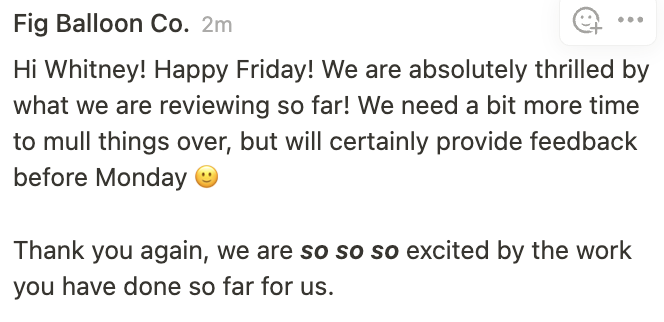 After you sign your contract and pay your deposit, I'll send you a link where you can join your project portal and schedule a strategy kick-off call for the week prior to your start date. This research phase is crucial to the success of the project. We'll discuss your target audience, competitor landscape, brand traits, positioning, and visual inspiration.
